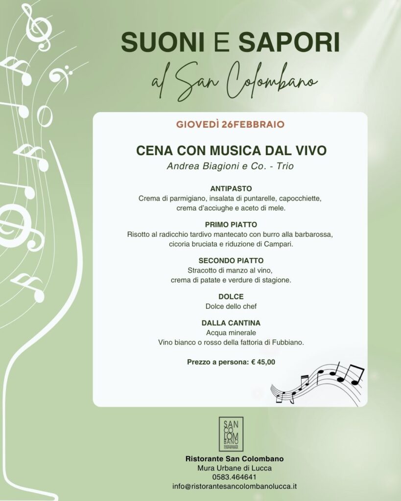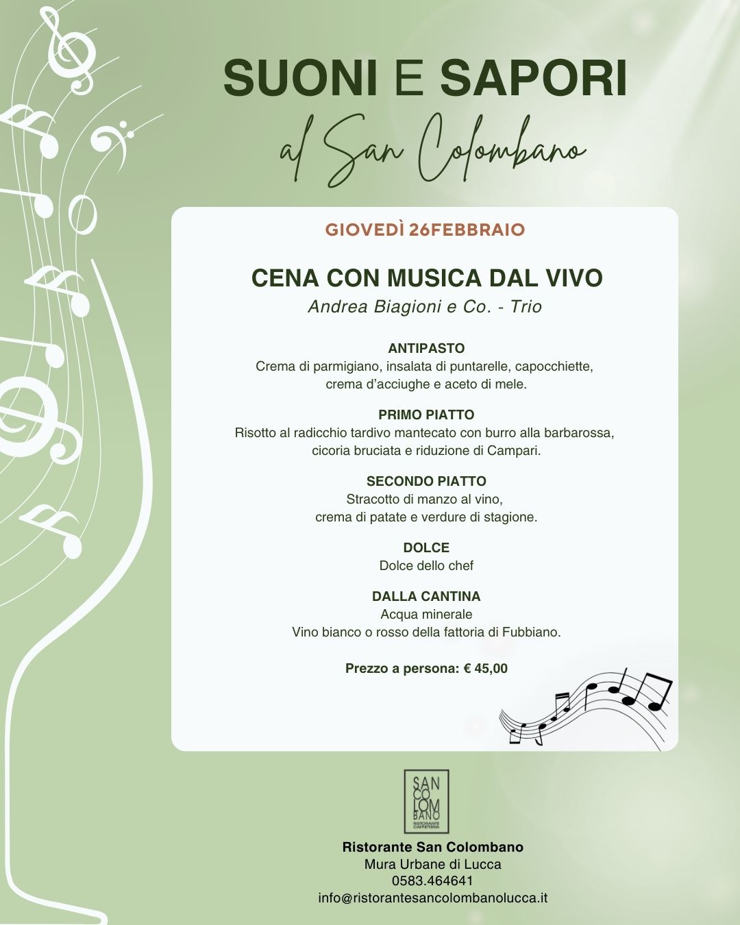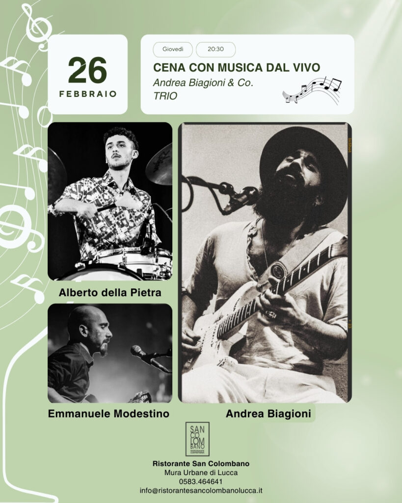 Per l’ultimo appuntamento della rassegna “Suoni e Sapori”, giovedì 26 febbraio alle ore 20:30, il Ristorante San Colombano propone una serata dove l’eccellenza gastronomica sposa le note sofisticate di Andrea Biagioni, Emmanuele Modestino e Alberto Della Pietra.